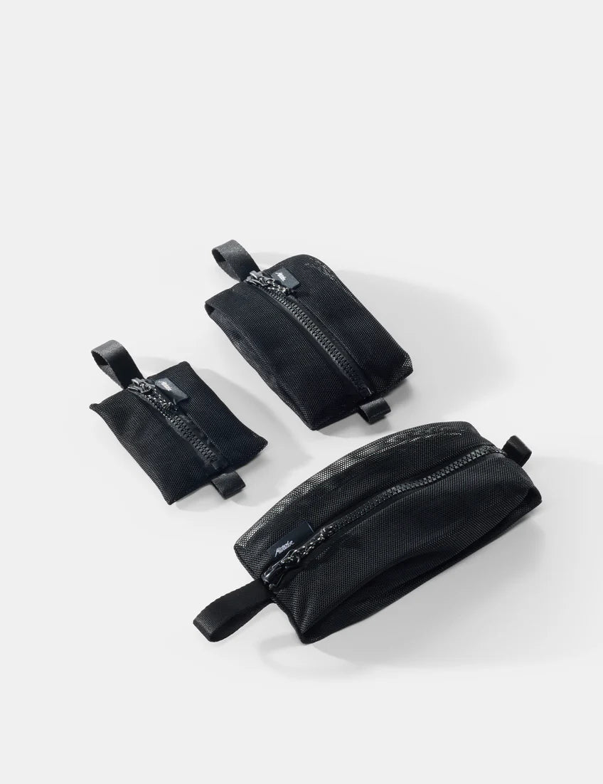 The Mesh Organizer Bag Set tames the small stuff — chapstick, earplugs, charging cables, all the essentials that tend to disappear. Three see-through pouches, one less thing to worry about.